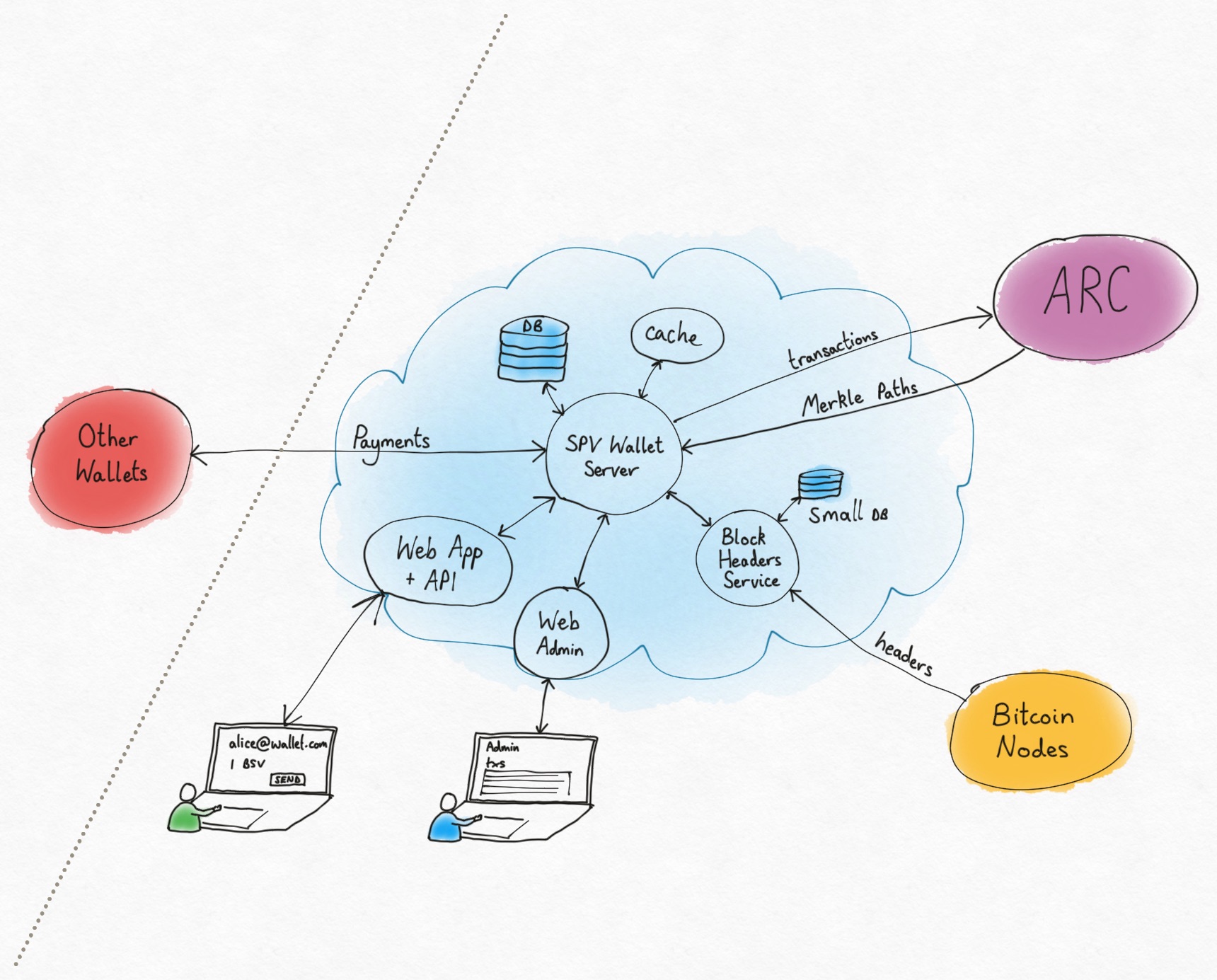 We see that there are two user interfaces, the Wallet App, and the Admin Console. These drive an API hosted by the SPV Wallet Server. This Wallet Server also accepts payments from Other Wallets, and Broadcasts Transactions to ARC. ARC returns Merkle Paths to confirm transactions, which are validated by checking Merkle roots stored by Blockheader Service.