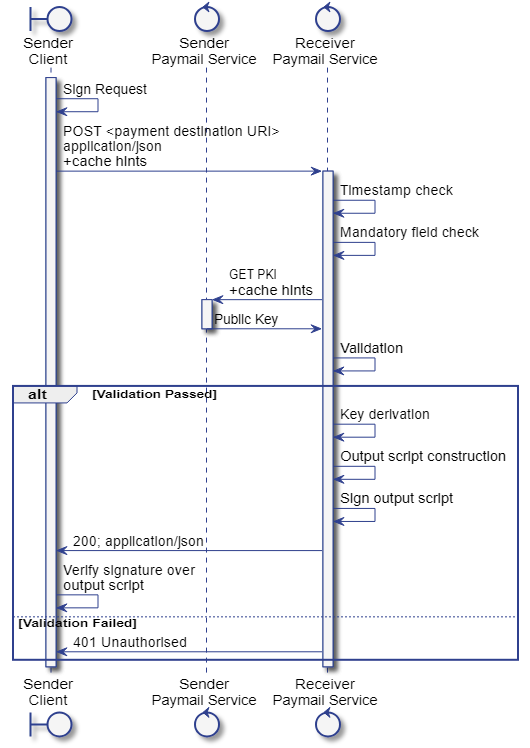 * Receiver services *MUST* perform a PKI lookup of the sender's paymail handle included in the request `senderHandle` field. If no public key can be resolved, the request *MUST* fail with HTTP response code `401` (Unauthorized)