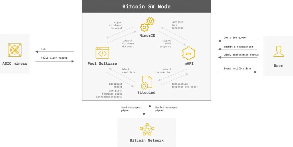 The node software is commonly referred to as Bitcoind or simply BSV Node software, which is based on the original implementation of the Bitcoin protocol implemented as a monolith. There is ongoing work for an improved and scalable microservice implementation of the Bitcoin protocol to support a much larger network throughput of transaction processing. This upgrade will aim to support terabyte-size blocks and more than a million TPS throughput. Such a scaled blockchain network aims to support varied types of transactions and application use cases for global utility and commerce.